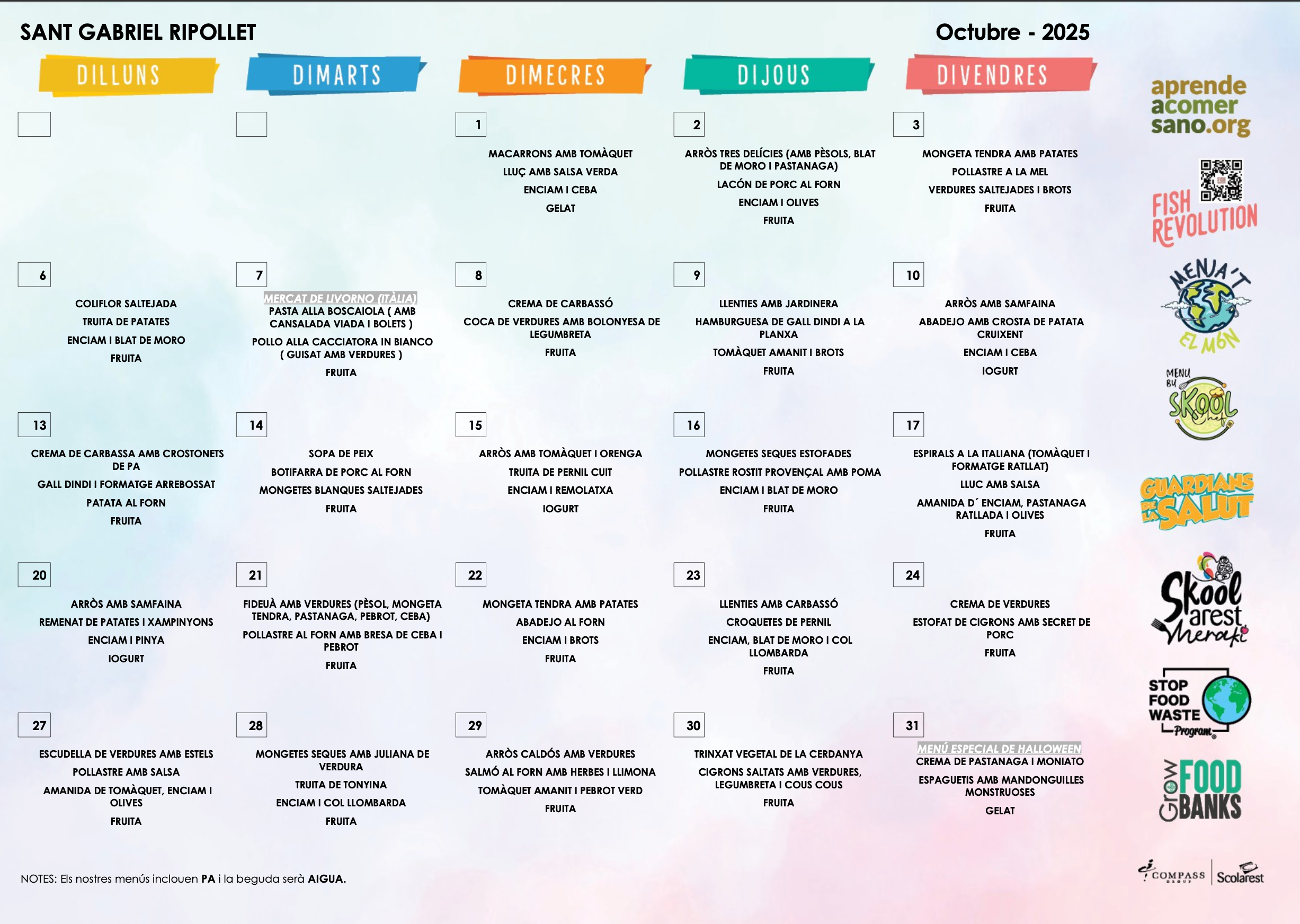 El menú canvia de forma mensual; es pot consultar a continuació: si hi cliqueu s’obriran les opcions d’al·lèrgens.